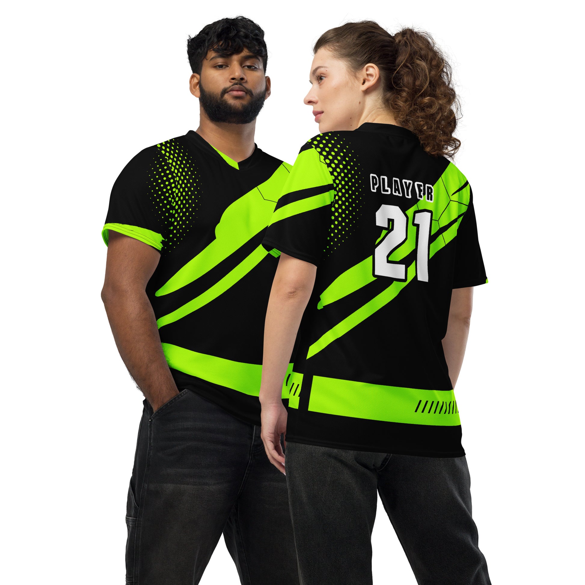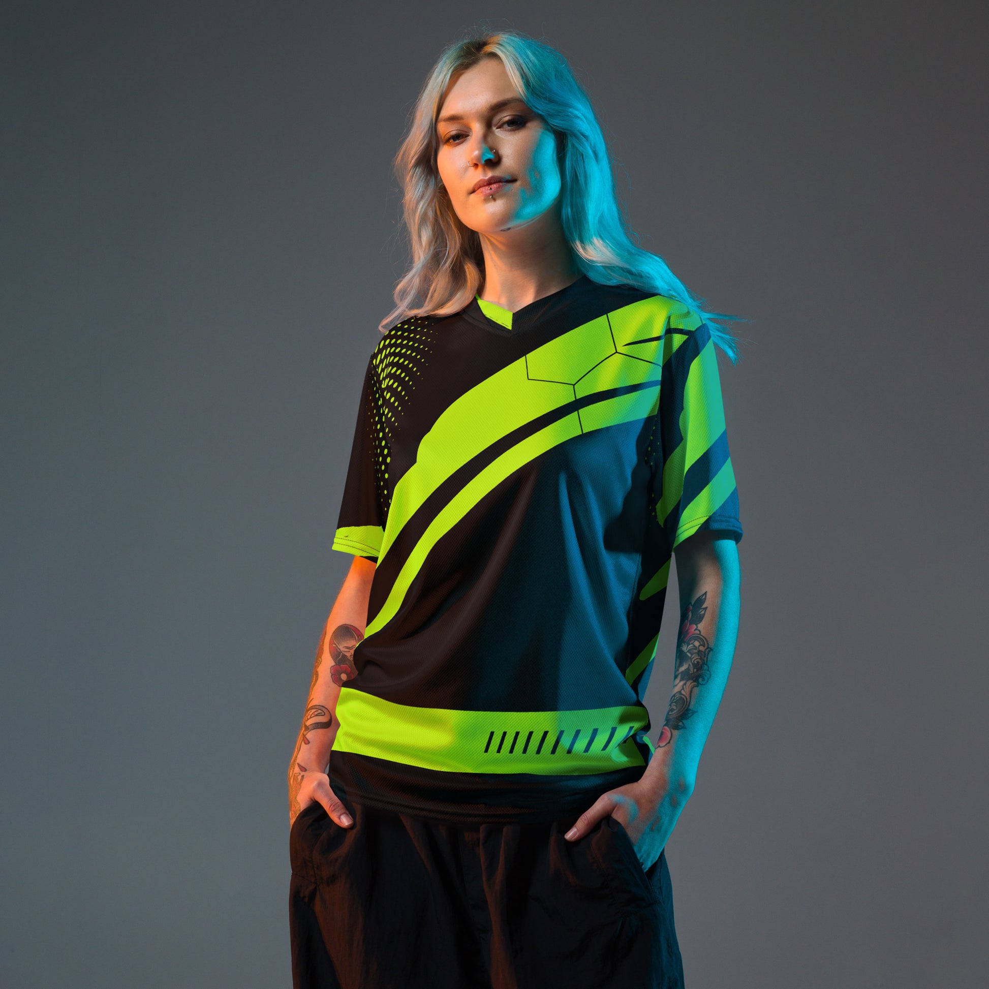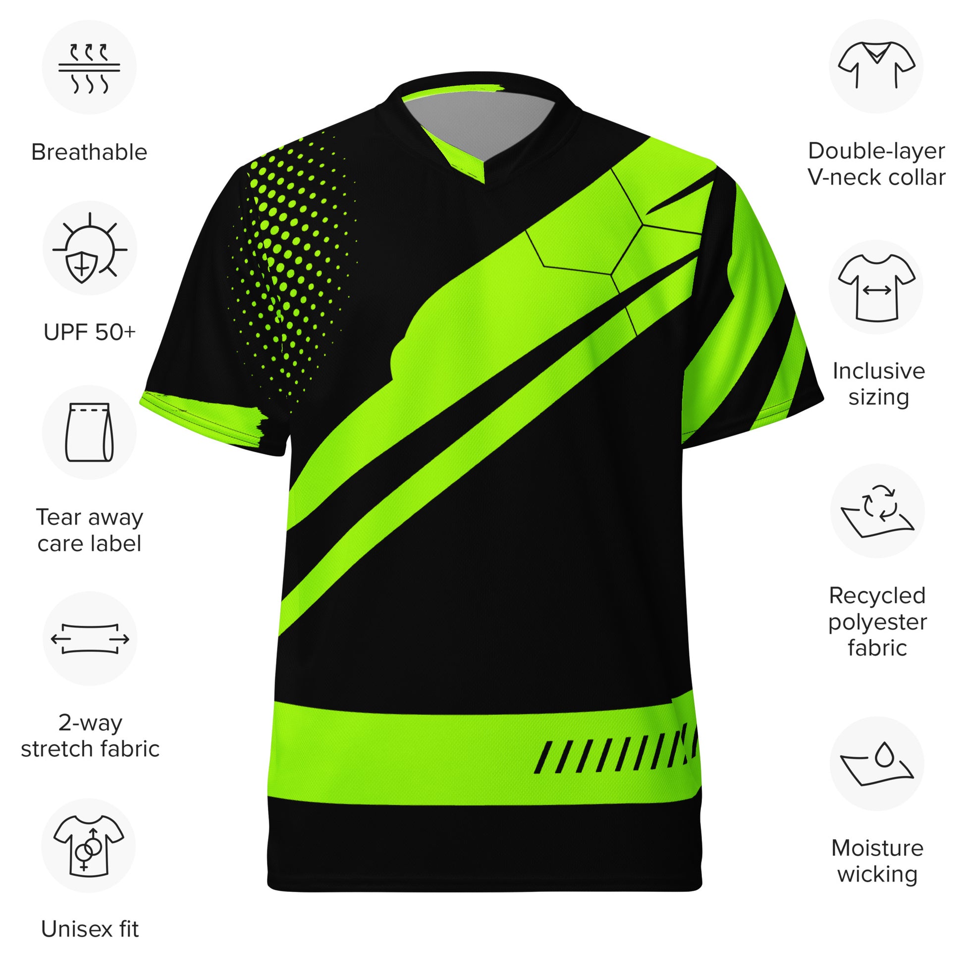 Looking for the perfect sports jersey? We have you covered—made of 100% recycled polyester fabric, this shirt is breathable, moisture-wicking, and has a double-layered v-neck collar that creates a premium look.